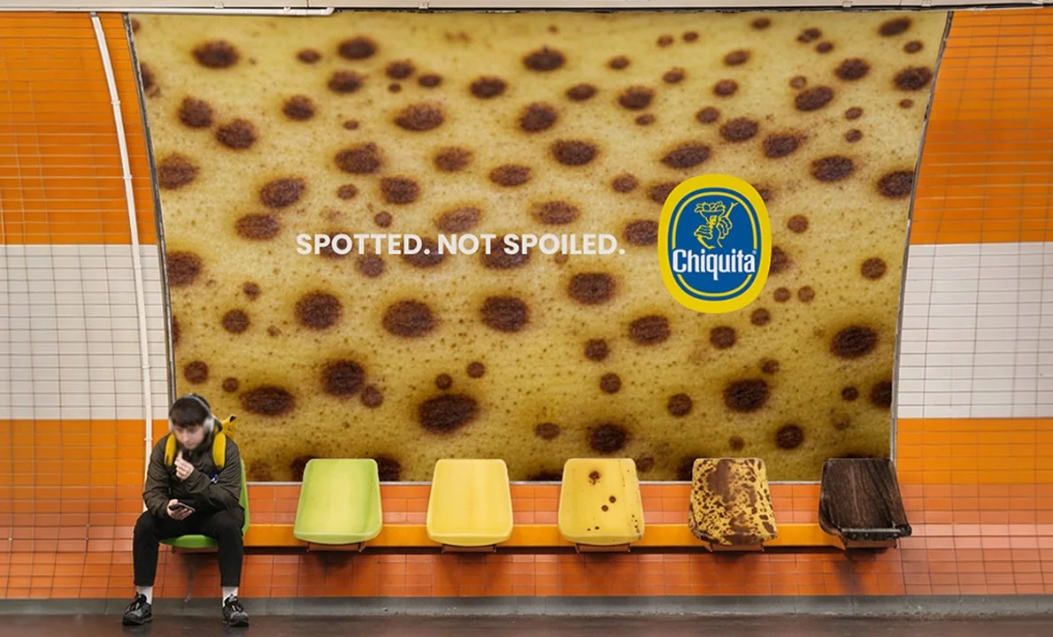 To extend the idea beyond traditional media, a public installation visualizes the stages of banana ripeness in a familiar setting. A row of identical chairs is placed in a waiting-room environment, with each seat wrapped in imagery representing a banana’s progression from green to yellow to spotted.